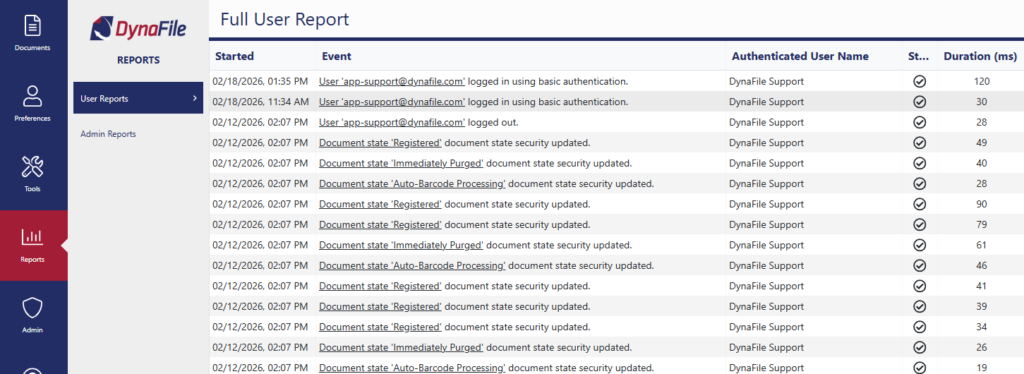 - An in-depth record of all events initiated by your account in DynaFile